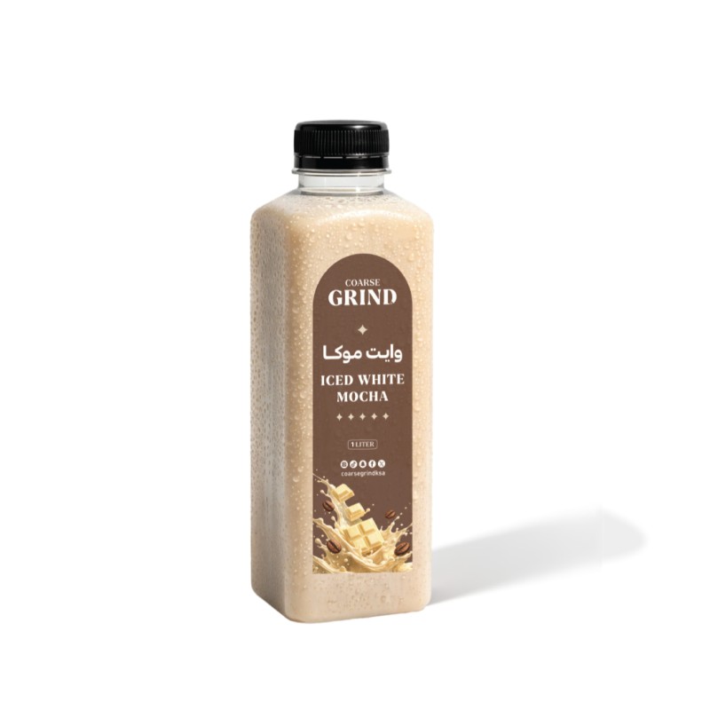 مشروب وايت موكا كريمي بطعم غني ولمسة شوكولاتة بيضاء مميزة — محضّر بعناية في زجاجة لتر مثالية للمشاركة أو الاستمتاع طوال اليوم.